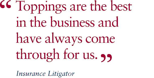 "Toppings offer an in-depth and intricate knowledge and understanding of claims entitlement beyond those of even advanced handlers. When a referral is sent to Toppings I can have confidence that a fair and justified settlement is achieved."